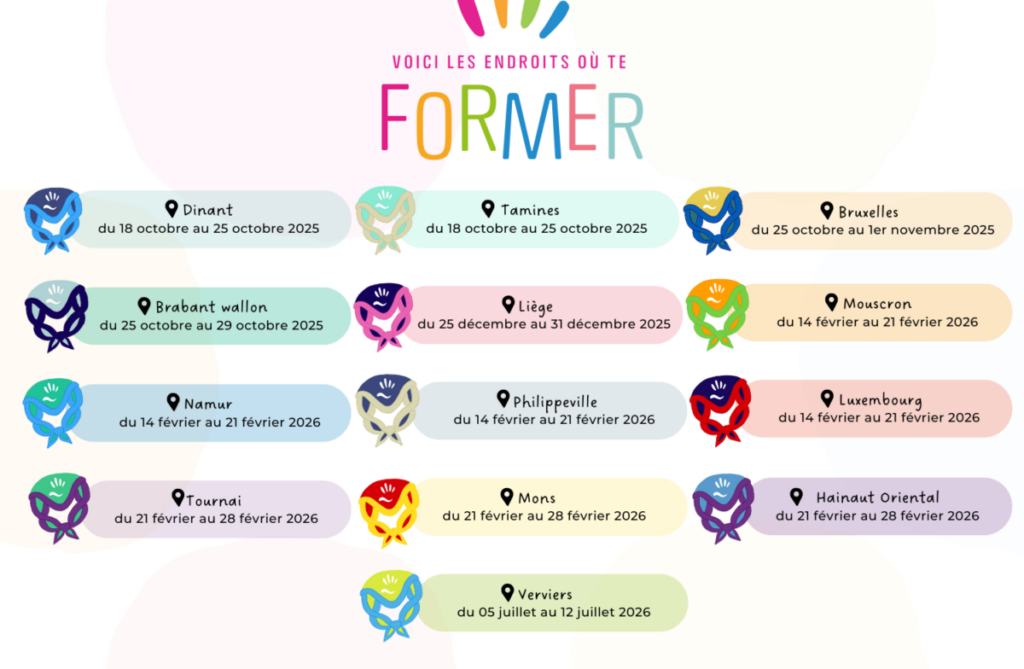 En tant que volontaire, dès ton arrivée, tu seras attaché à une régionale. Une régionale c’est un territoire délimité en Wallonie ou à Bruxelles, c’est en fonction de ton domicile que tu sauras laquelle rejoindre. Au moment de choisir la formation à laquelle tu t’inscris, n’oublie pas de vérifier qu’il s’agit bien de ta future régionale qui en est l’organisatrice.